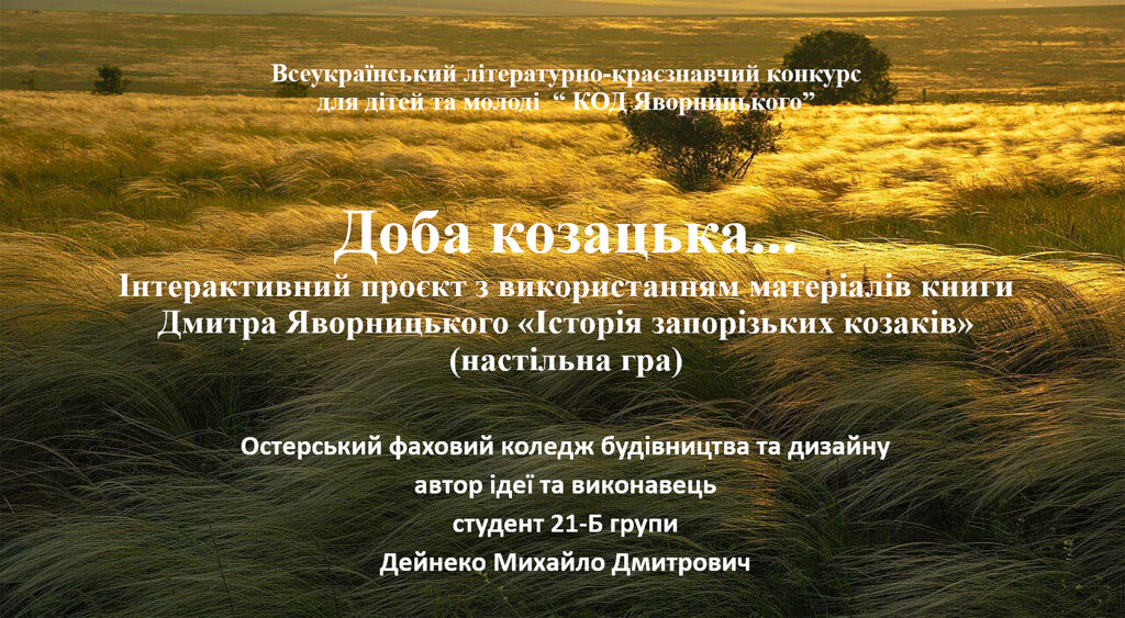навчаюся будівельній справі, проте мені також дуже подобається вивчати історію рідного краю, проводити дослідження та робити відкриття. Наприклад, моє прізвище Дейнеко означає «кий» або «козацьку юрбу», озброєну киями та палицями. Готуючись до занять з історії України, особливо на тему козацтва, я часто звертався до наукової спадщини Дмитра
