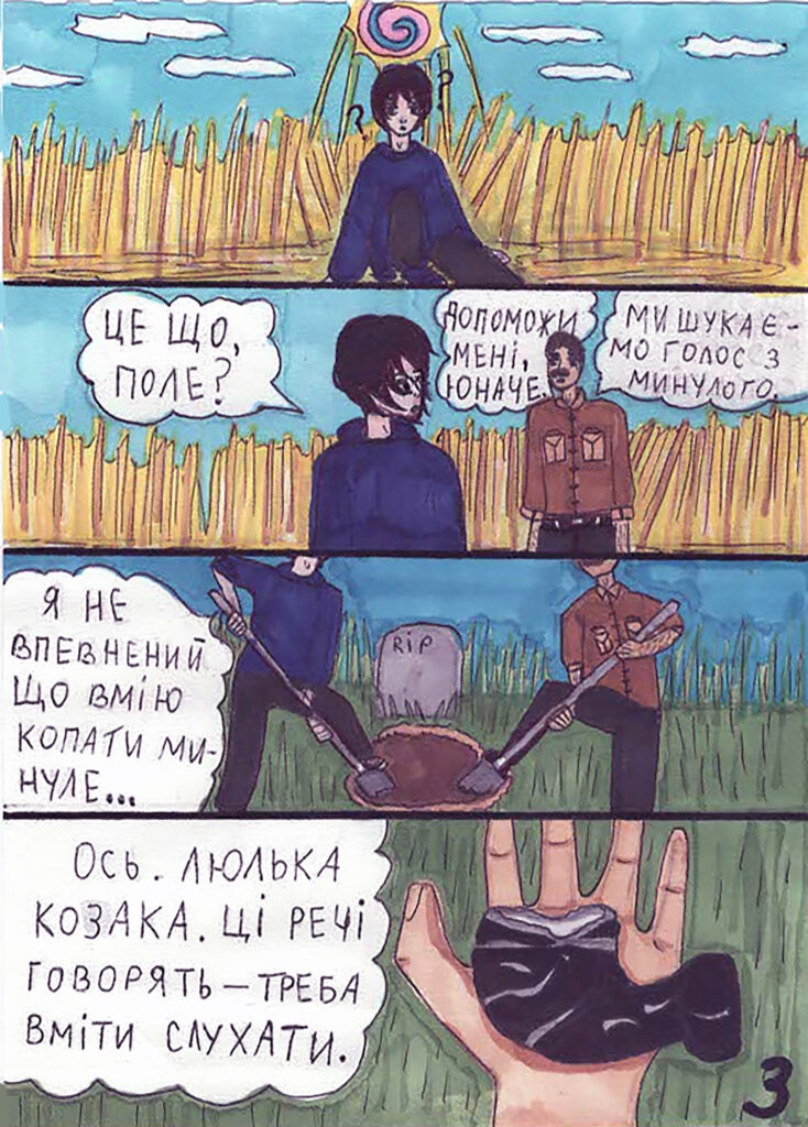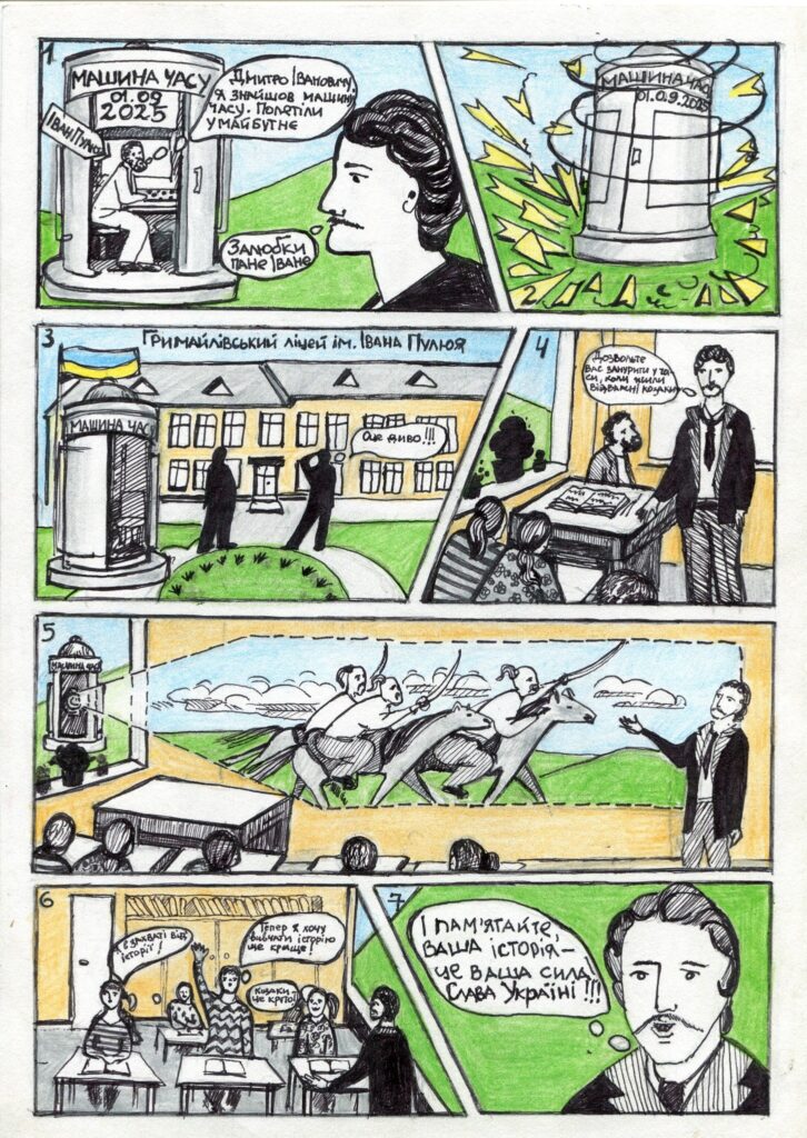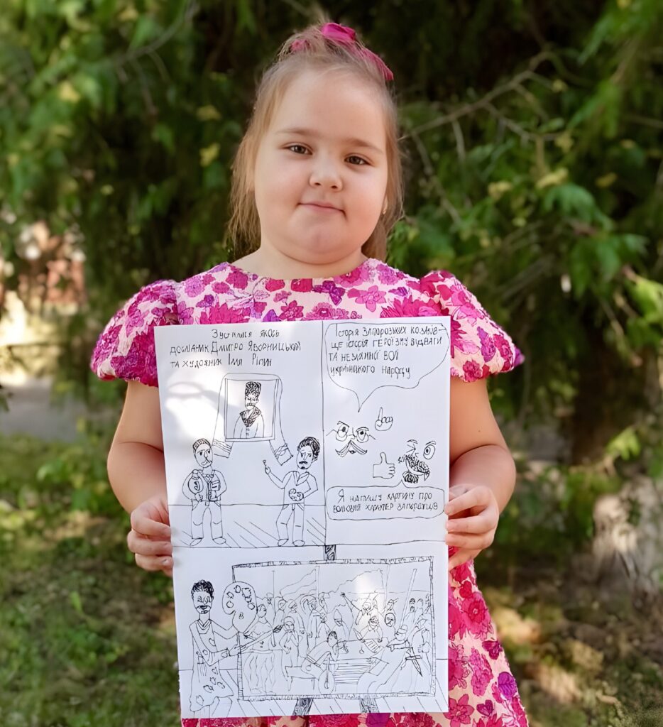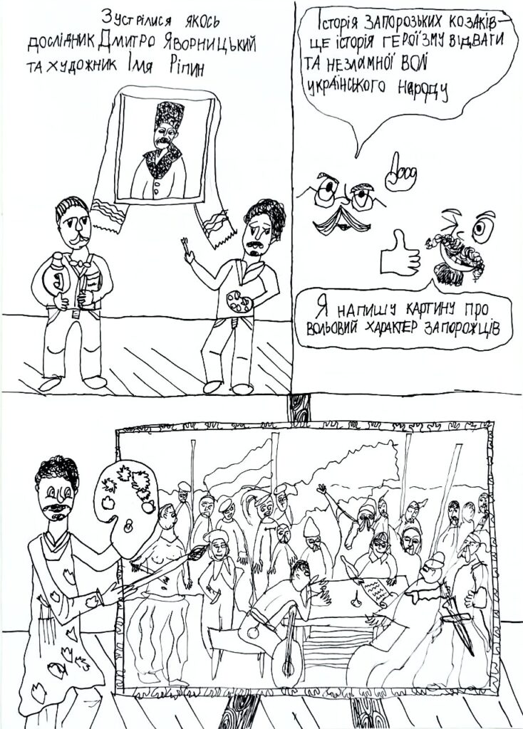Я, Гіль Уляна, учениця 3 класу Устилузького ліцею Устилузької міської ради Волинської області. Юна читачка Устилузької міської публічної бібліотеки. Учасниця всеукраїнського проєкту-конкурсу «Код Дмитра Яворницького» 2025 року. Представляю комікс “Дружба Дмитра Яворницького та Іллі Ріпина”. Своїм малюнком хочу показати історію виникнення картини «Запорожці пишуть лист до турецького султана». Картина була написана українським художником Іллєю Ріпиним у двох варіантах. Нині видатний шедевр, який належить Харківському музею мистецтва, можна побачити у Львові в галереї Zag. Наставниця Тетяна Токарева Арт-студія «Фіглі-Міглі» у місті Володимир Волинської області.